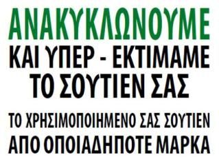 Πηγή:Από τις 11/03/2011 έως 30/06/2011 σε όλα τα καταστήματα INTIMISSIMI θα υπάρχουν κάδοι ανακύκλωσης για να πας και να δώσεις τα "παλιά" σουτιέν σου οποιασδήποτε μάρκας.